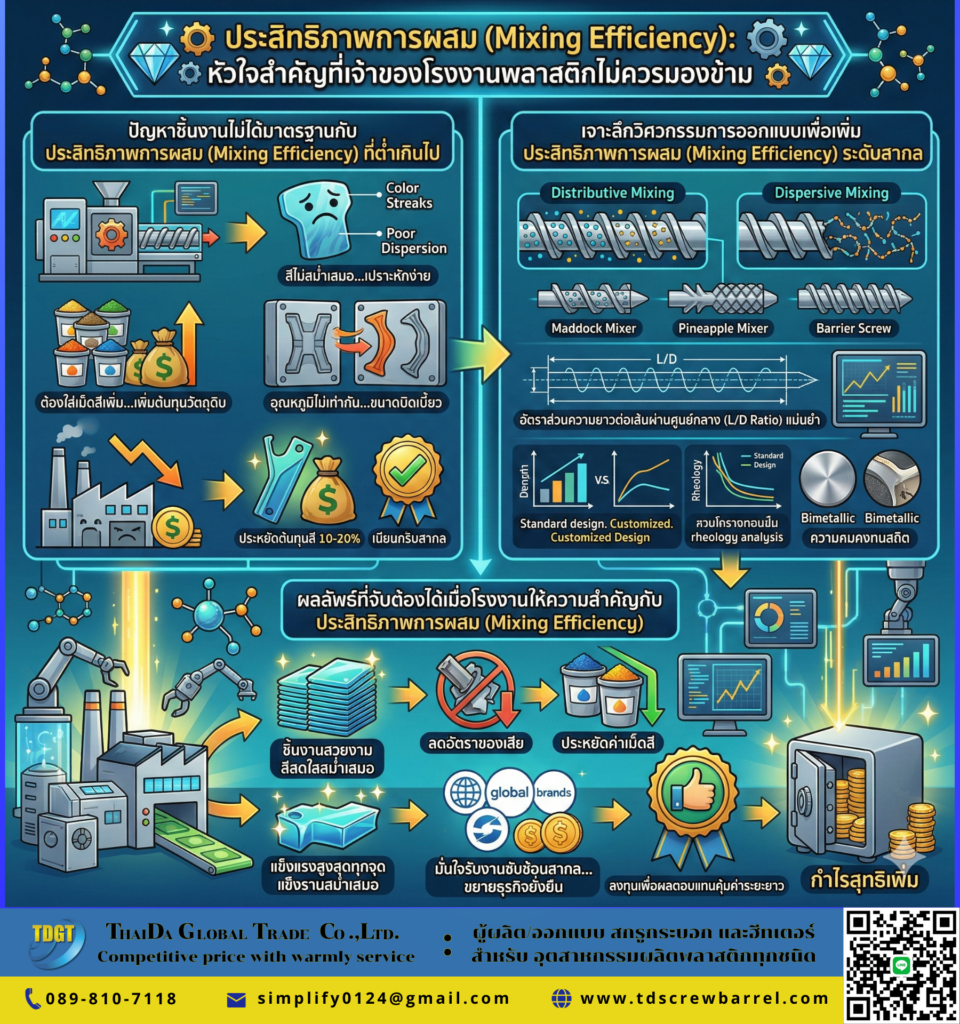 เพื่อให้การผลิตก้าวข้ามขีดจำกัดเดิมๆ การเลือกใช้สกรูที่ผ่านการออกแบบเชิงวิศวกรรมขั้นสูงจึงเป็นเรื่องจำเป็นครับ ในระดับสากลเราให้ความสำคัญกับกลไกการผสมสองรูปแบบ คือ Distributive Mixing และ Dispersive Mixing ครับ โดยการออกแบบชุดสกรูที่มีส่วนผสมของ Maddock Mixer, Pineapple Mixer หรือ Barrier Screw จะเข้ามาช่วยเพิ่มพื้นที่ผิวสัมผัสและสร้างแรงตัดเฉือน (Shear Stress) ที่พอเหมาะครับ ยิ่งไปกว่านั้น การคำนวณอัตราส่วนความยาวต่อเส้นผ่านศูนย์กลาง (L/D Ratio) ที่แม่นยำ จะเป็นกุญแจสำคัญที่ช่วยให้ ประสิทธิภาพ การผสม (Mixing Efficiency) พุ่งสูงขึ้นโดยไม่ต้องเพิ่มอุณหภูมิความร้อนจนทำลายคุณสมบัติพลาสติกครับ