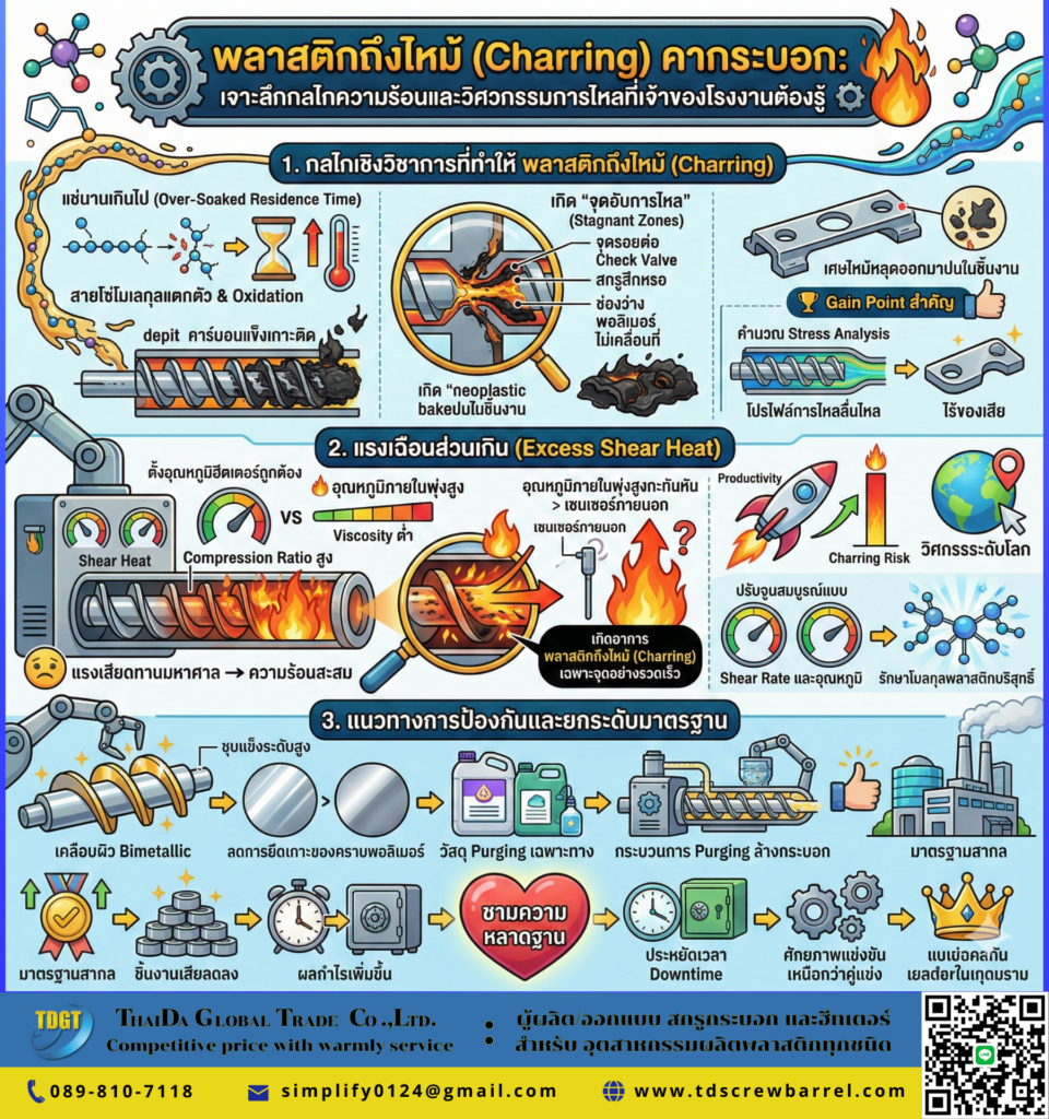 ปัญหา พลาสติกถึงไหม้ (Charring) ในกระบอกสกรูเกิดจากอะไร? เจาะลึกสาเหตุเชิงวิชาการ ตั้งแต่จุดอับการไหลจนถึงแรงเฉือนที่สูงเกินไป